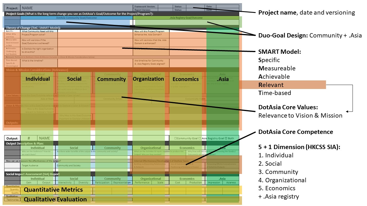 Between January and April of 2020, with the generous support from experts on the subject matter at HKCSS, the DotAsia team combined a few important components from different models into a customized DotAsia SIA Framework, featuring a Duo-Goal approach placing emphasis on both community contribution and the development of the .Asia gTLD; adopting the S.M.A.R.T. model (Specific, Measureable, Achievable, Relevant and Time-based) in defining the Theory of Change (ToC), and incorporating into the output measurements the HKCSS SIA 5 dimension framework (1. Individual; 2. Social; 3. Community; 4. Organizational; and, 5. Economics), plus an extra dimension on supporting the .Asia Registry.